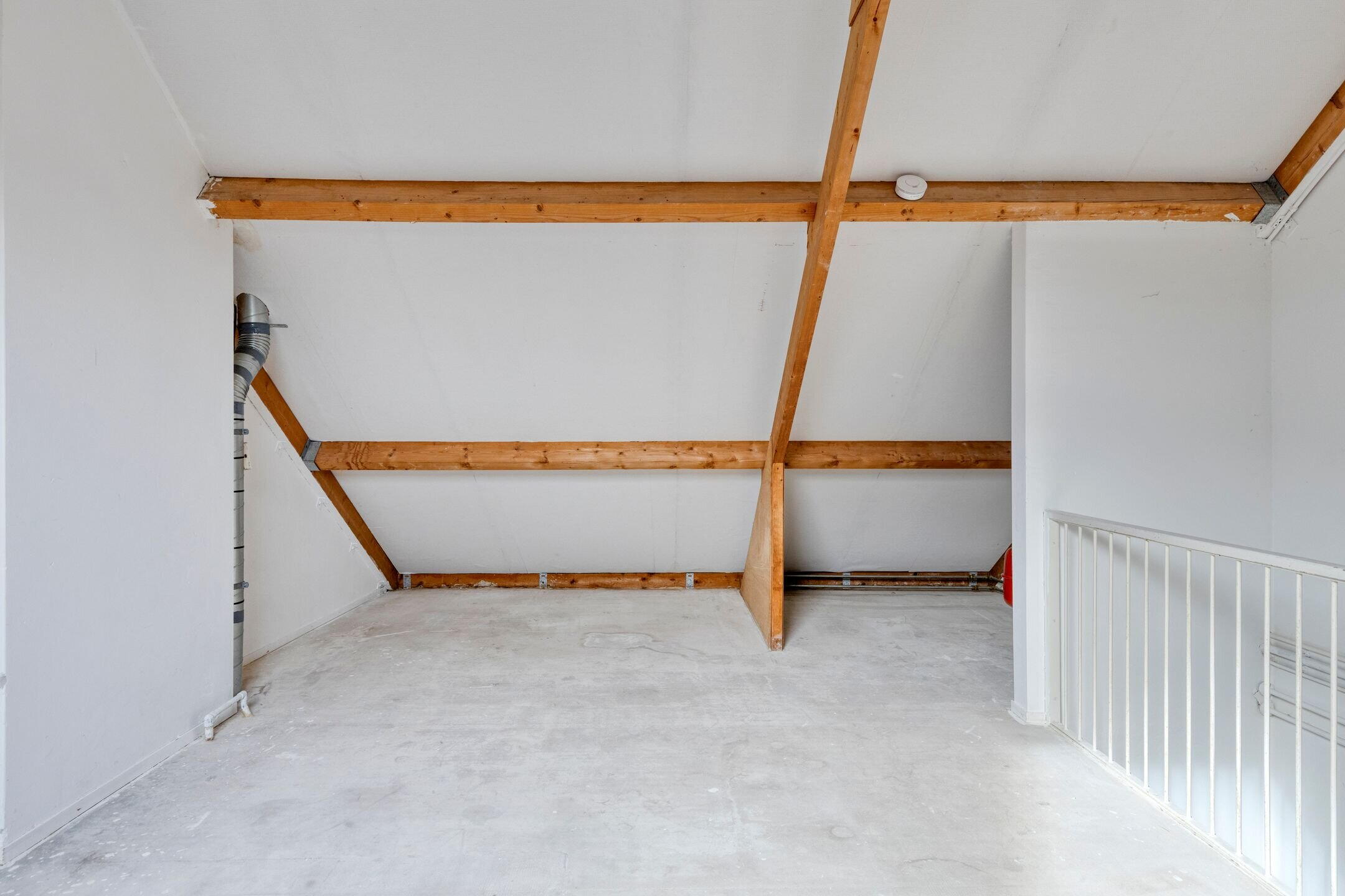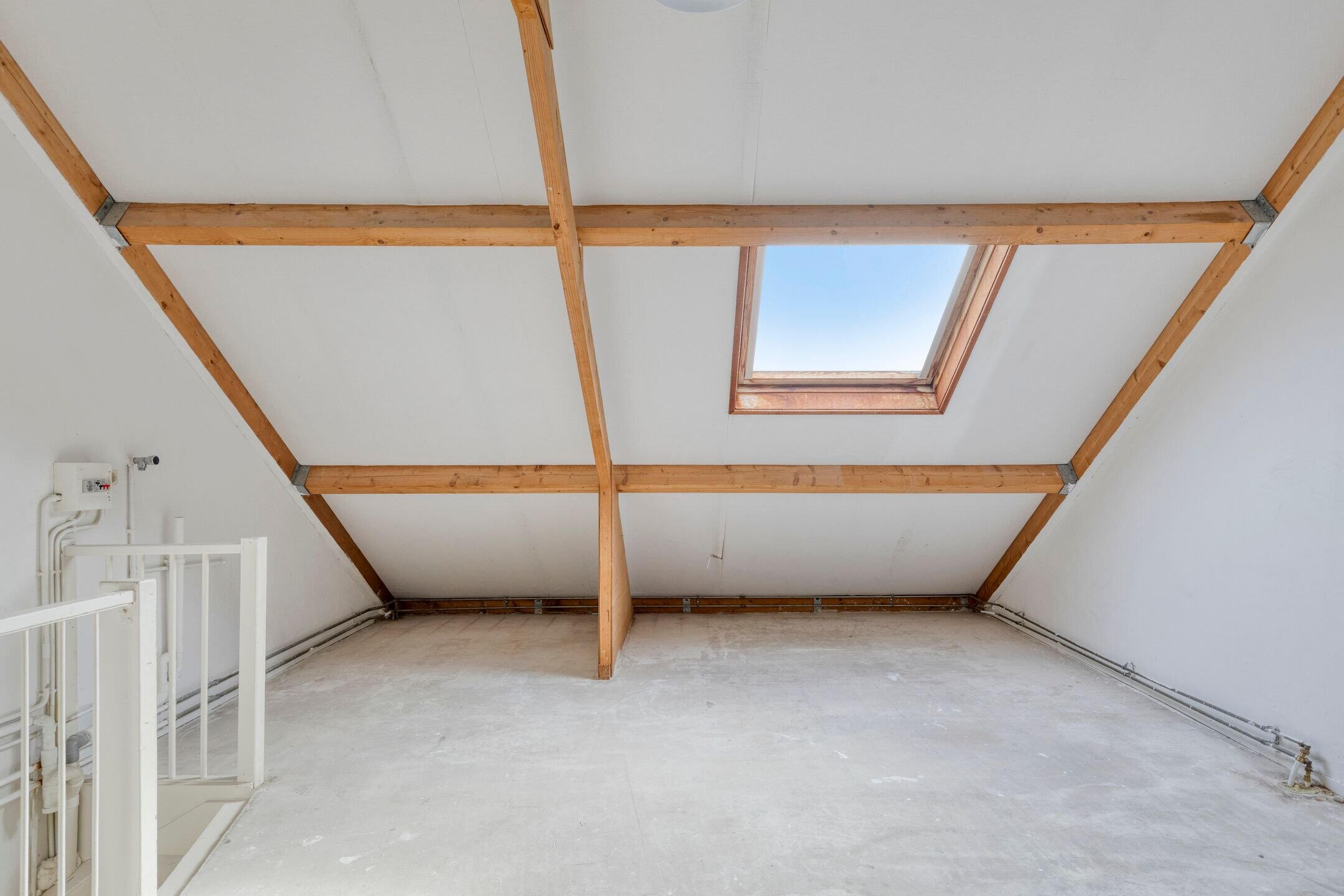 Tweede verdieping: Via een vaste trap bereik je de tweede verdieping waar je een ruime open zolder treft met de opstelplaats voor de wasmachine, alsmede de opstelplaats voor de CV installatie; het realiseren van een VIERDE ruime slaapkamer is eenvoudig. Een Velux raam zorgt voor meer dan voldoende lichtinval.
